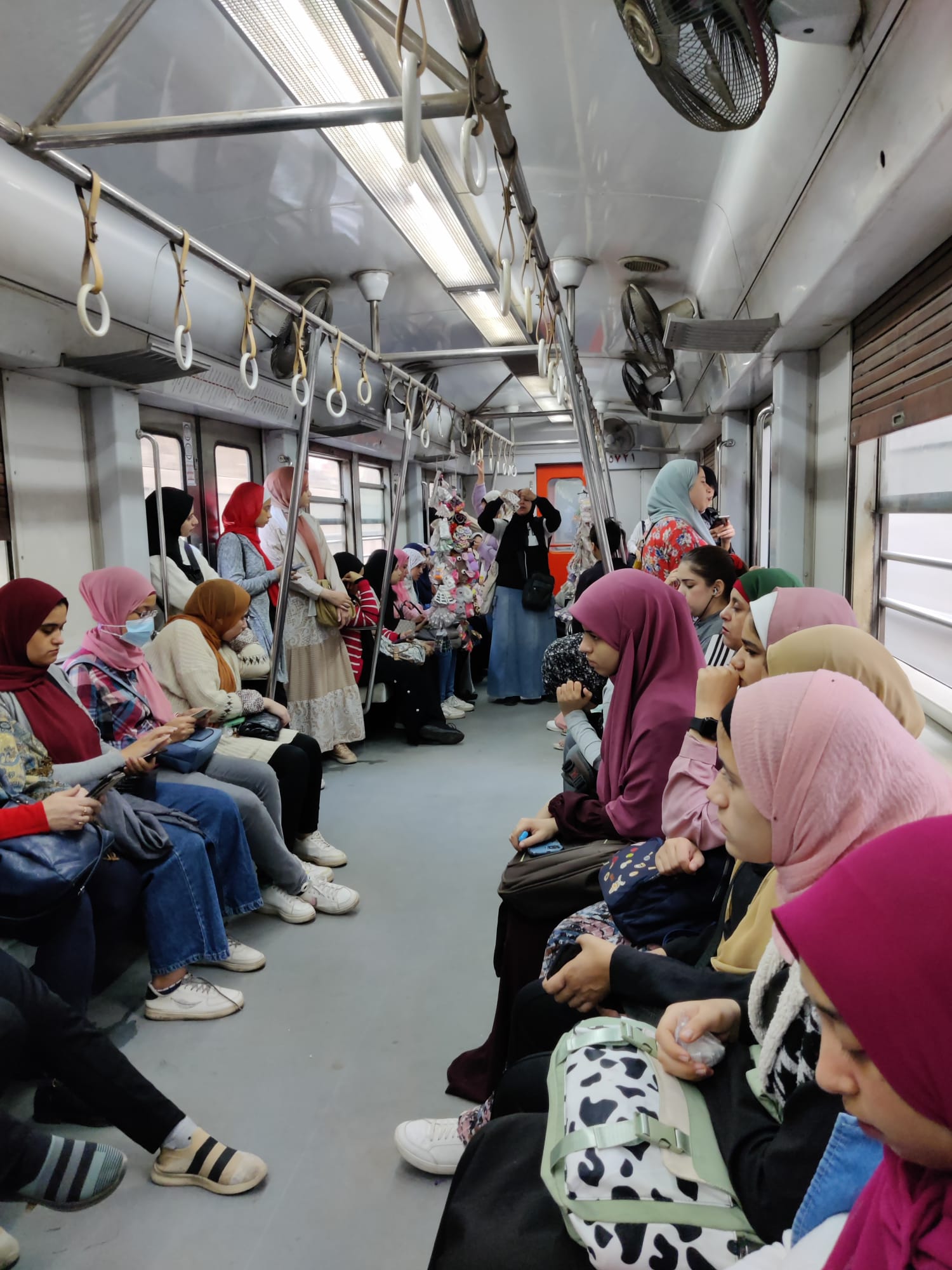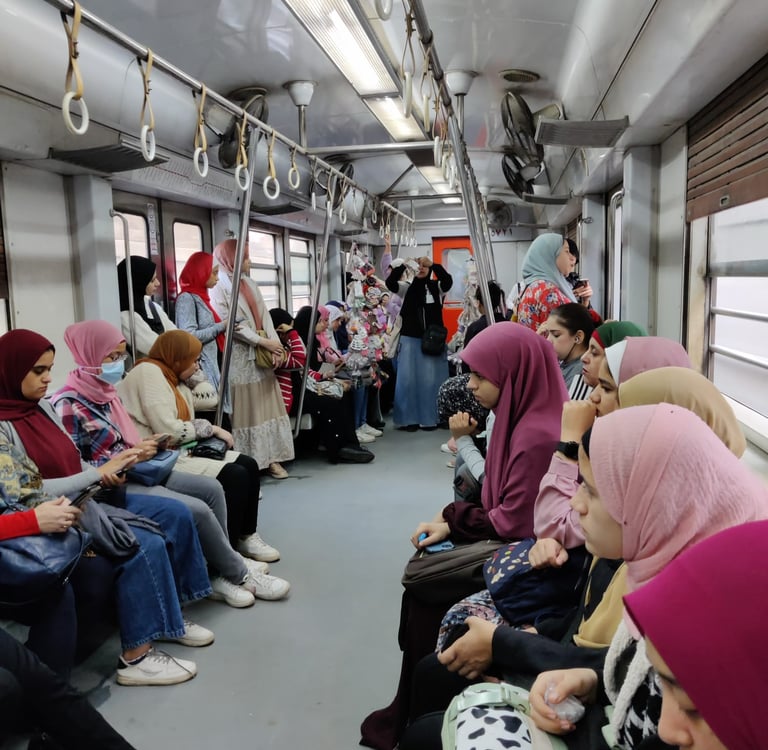 Los gritos de una vendedora me traen de vuelta al vagón del subte. Cuelga unos ganchos del agarramanos: racimos de bijouterie y barbijos. A través de las hendijas de las persianas de madera veo que estamos en la estación Mar Girgis. Pienso si así se sentirá ver con un Niqab, el velo que visten algunas de las mujeres del vagón, que sólo muestran sus ojos.